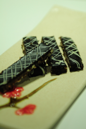 - Demould the set biscuits on a wire rack. Place a plate underneath the rack. Heat the remaining ganache, if need be with a tbsp of water and pour on the set biscuit mixture. Level the ganache on the sides with palette knife and keep in back in the fridge for 10-15 minutes to set.