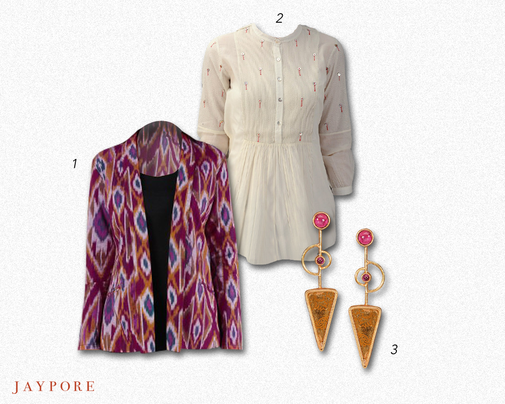 1. https://www.jaypore.com/burgundyrustecru-olive-burgundy-multi-color-hand-woven-ikat-cotton-jacket-by-jaypore-p61818