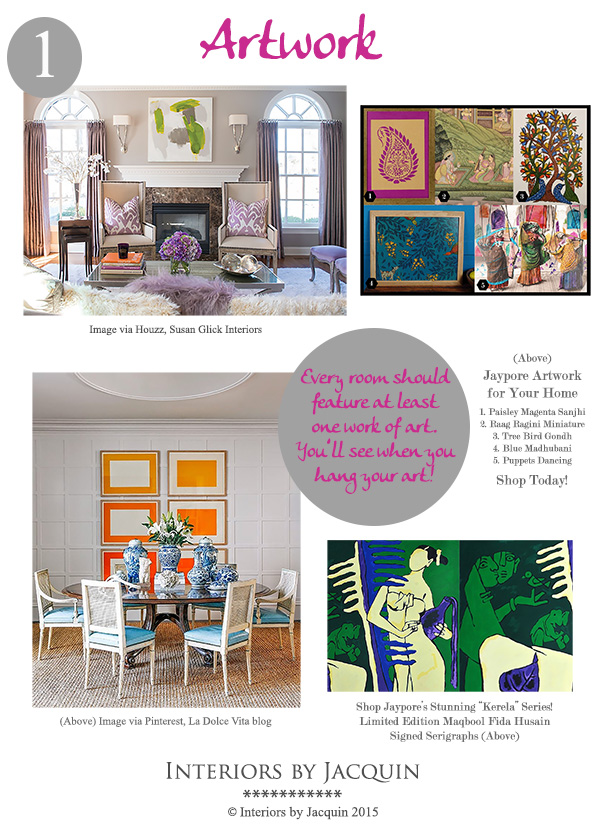My primary rule for decorating is to have at least one work of art up in each room. It’s a fun way to add color to a room and also show your personality based on your art taste. Here are some wall art options from Jaypore to get you started on a fabulous gallery wall! Take care to select artwork you really enjoy, as you’ll find that it will instantly be a focal point in your room. It’s easy to see how wall artwork can be an attractive focal point from the lovely room designs above, both featuring stunning wall art.