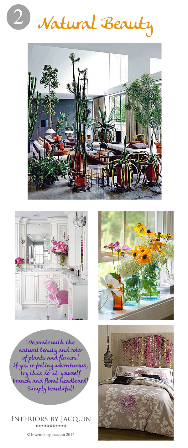 Bring the outdoors inside with the natural beauty of plants and flowers! Just take a look at the impact colorful plants have on these beautiful rooms below! If you love a do-it yourself project, you may just want to try your hand at creating the brightly colored, branch and floral headboard featured here. Simply tie strings of flowers onto a large sized branch and then adhere the branch to the wall above your bed. A unique a special feature for the nature lover and DIY crafter!