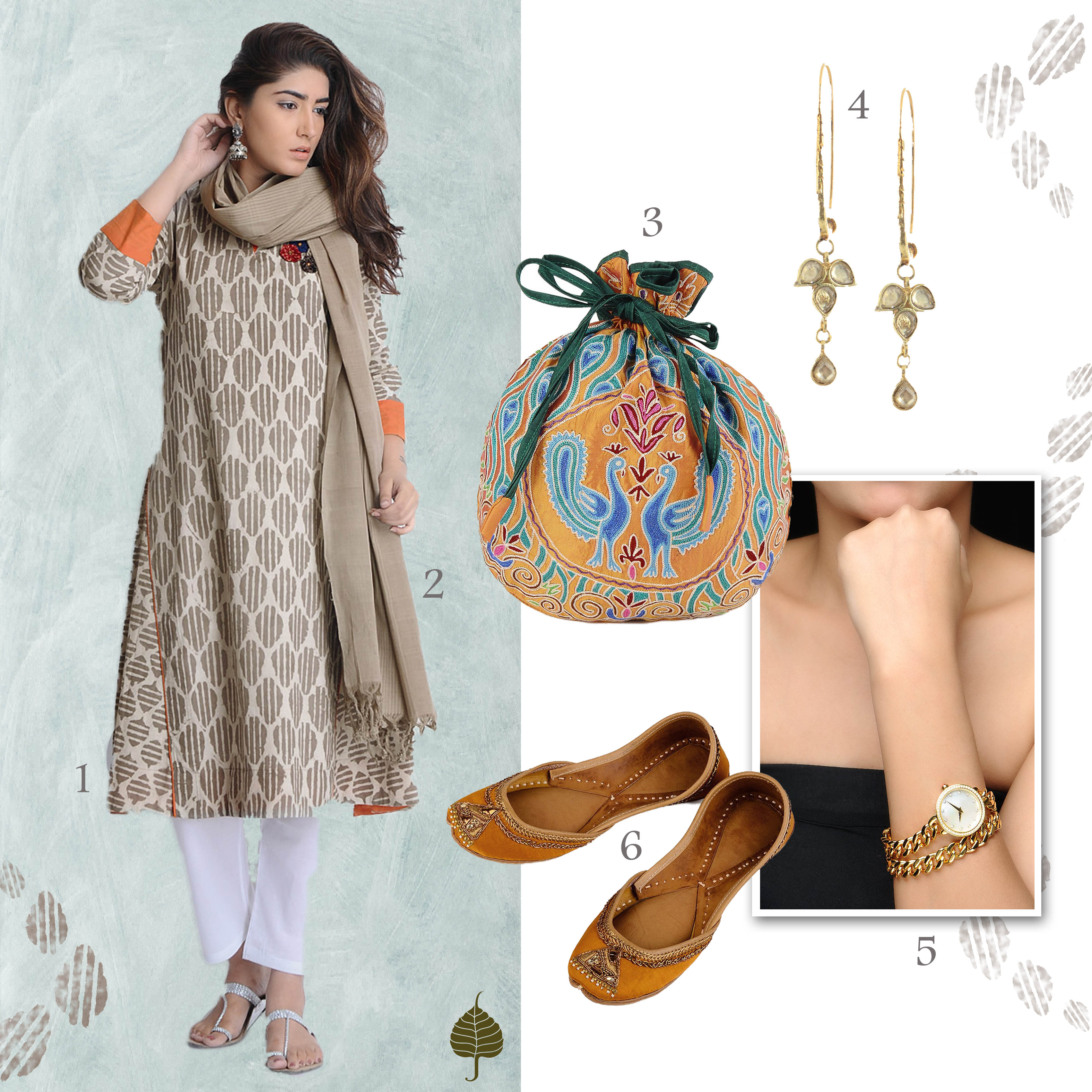 This ecru toned bagru printed kurta can be styled with a swarovski studded watch, zardosi juttis, silver earrings and a grey handwoven dupatta. The orange cuff details and a orange silken embroidered potli brighten up the look.