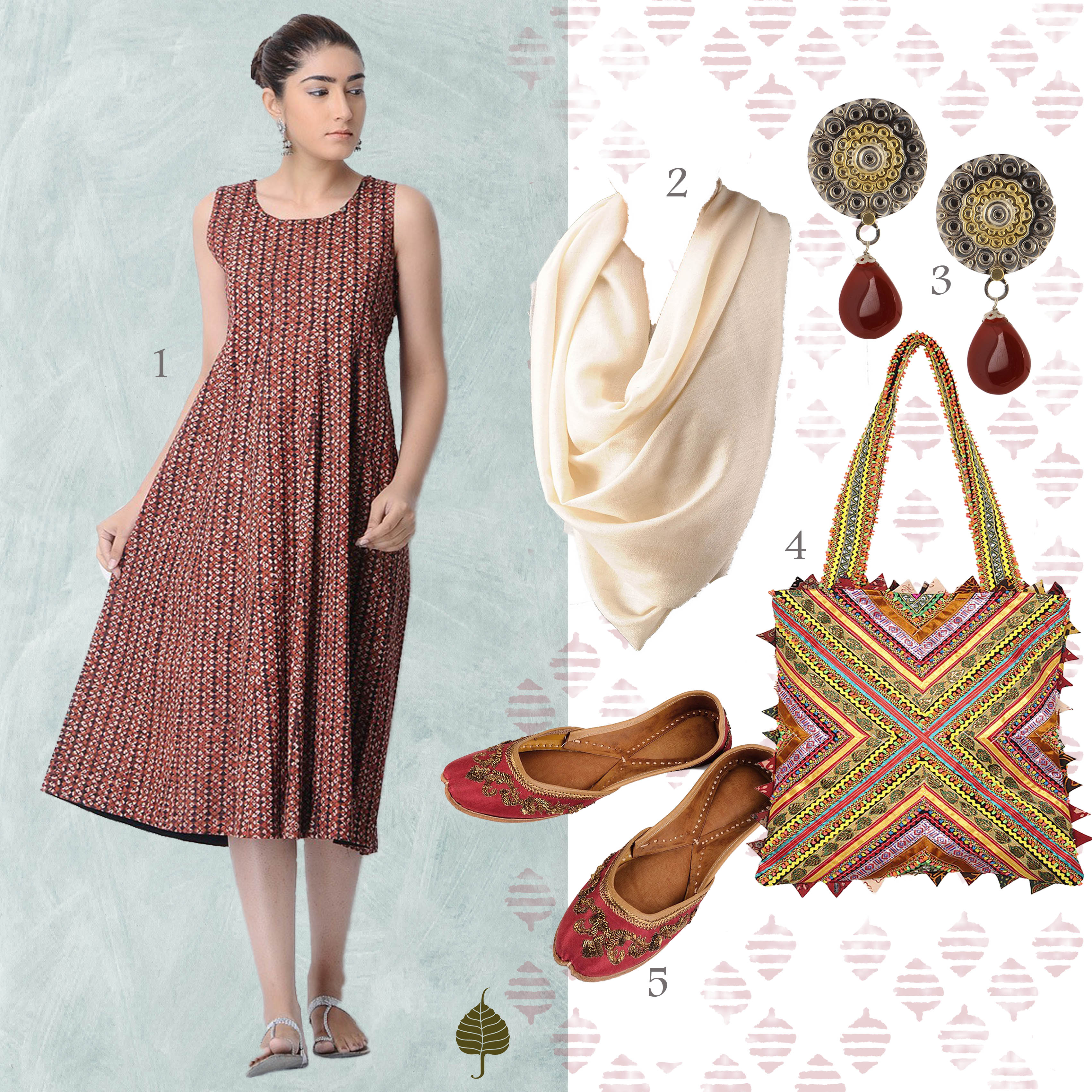 This red black natural dyed dress makes us want to do the side walk dance on the street! Dress it up with an ivory pashmina stole, silver earrings, mashru juttis and a cotton tote bag.