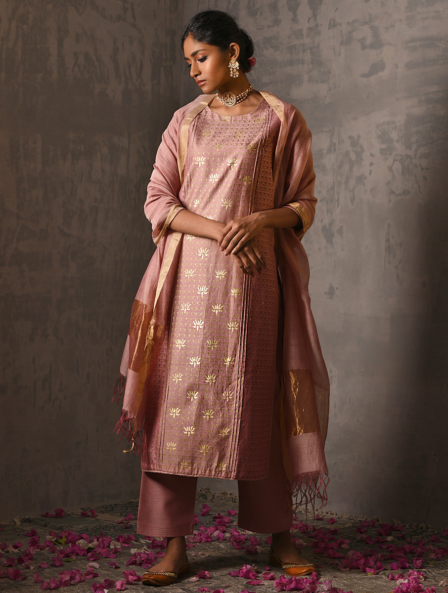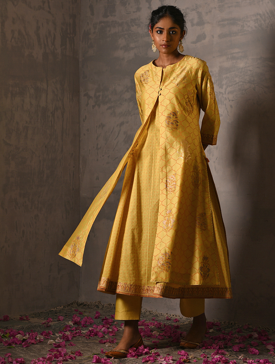Ring in the festivities with ‘Maharani,’ Jaypore’s newest collection of buttery soft Chanderi separates enlivened with foil-printed motifs, an enchanting sprinkling of khari, and finished with dainty hand-embroidered details, on a canvas of sumptuous shades of mustard, gold, teal, and dusty rose.