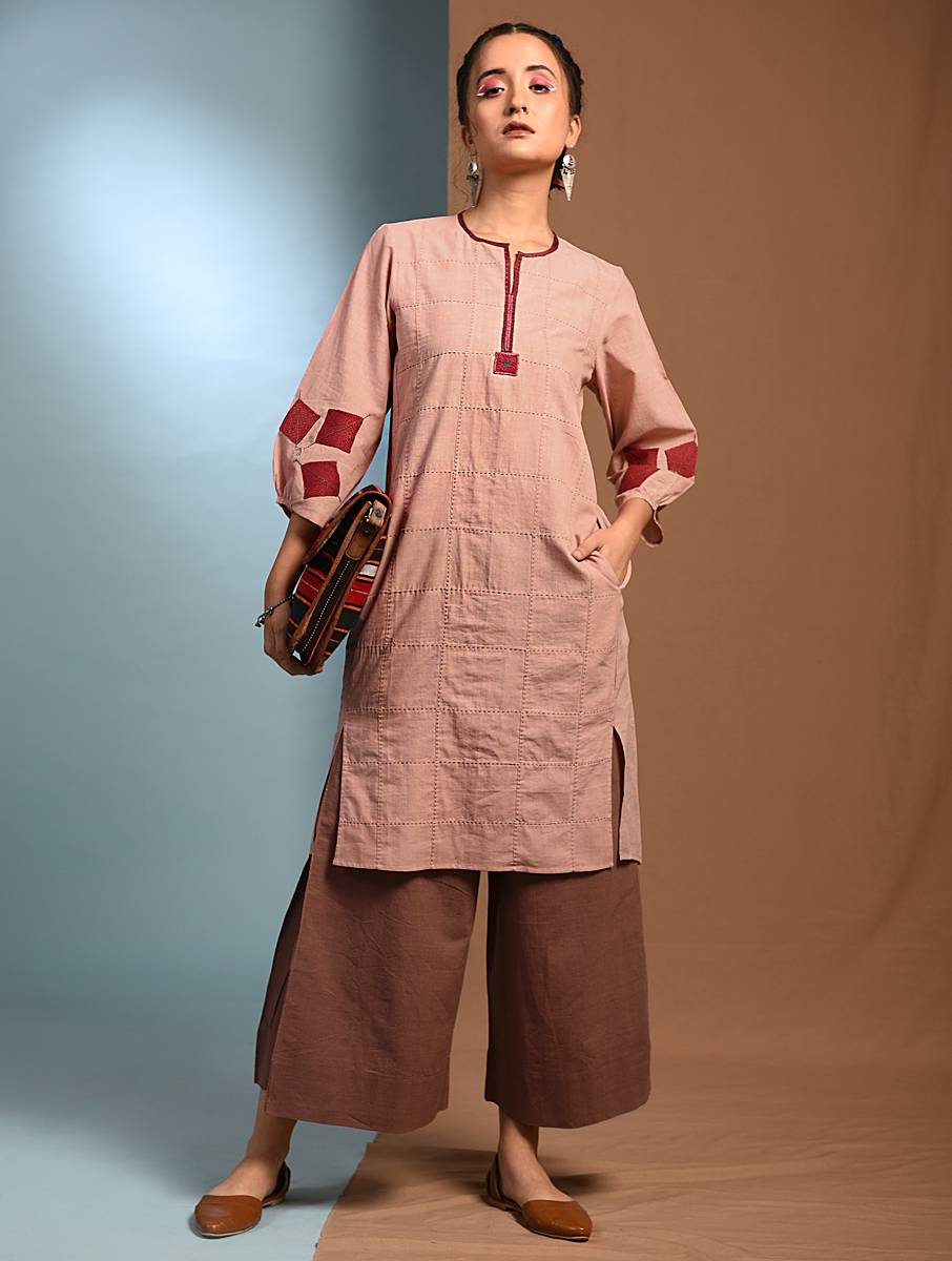 With striking patchwork embroidered details, fabric buttons, and micro-pleats, these handloom cotton pieces are the perfect addition to your summer wardrobe.