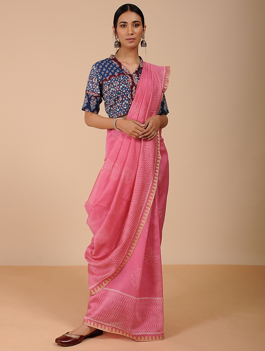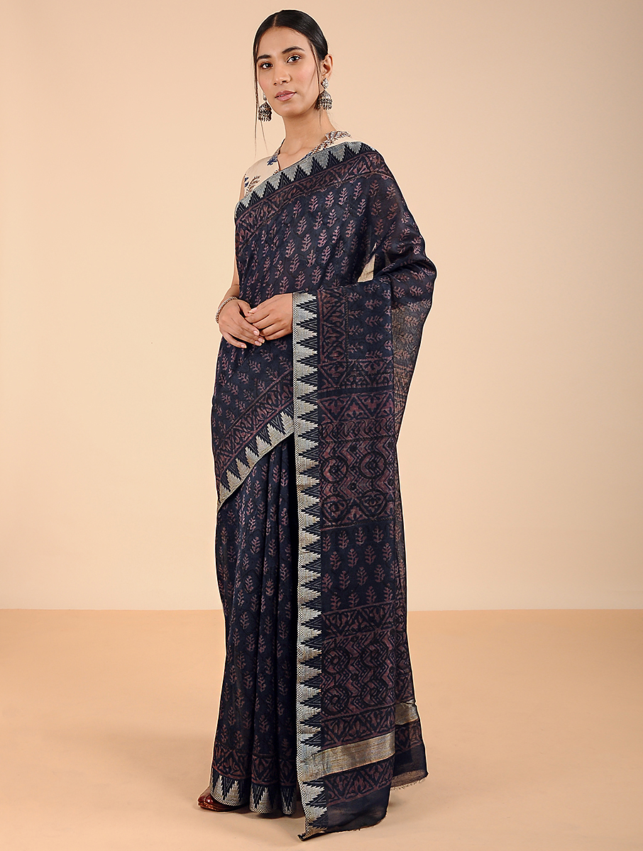 Crafted by master-printers, ‘chippas’, through the laborious technique of mud-resist printing, these sarees are a stunning addition to any wardrobe. These timeless sarees are best styled with simple silver jewelry and leather juttis for a neatly tied-together look.