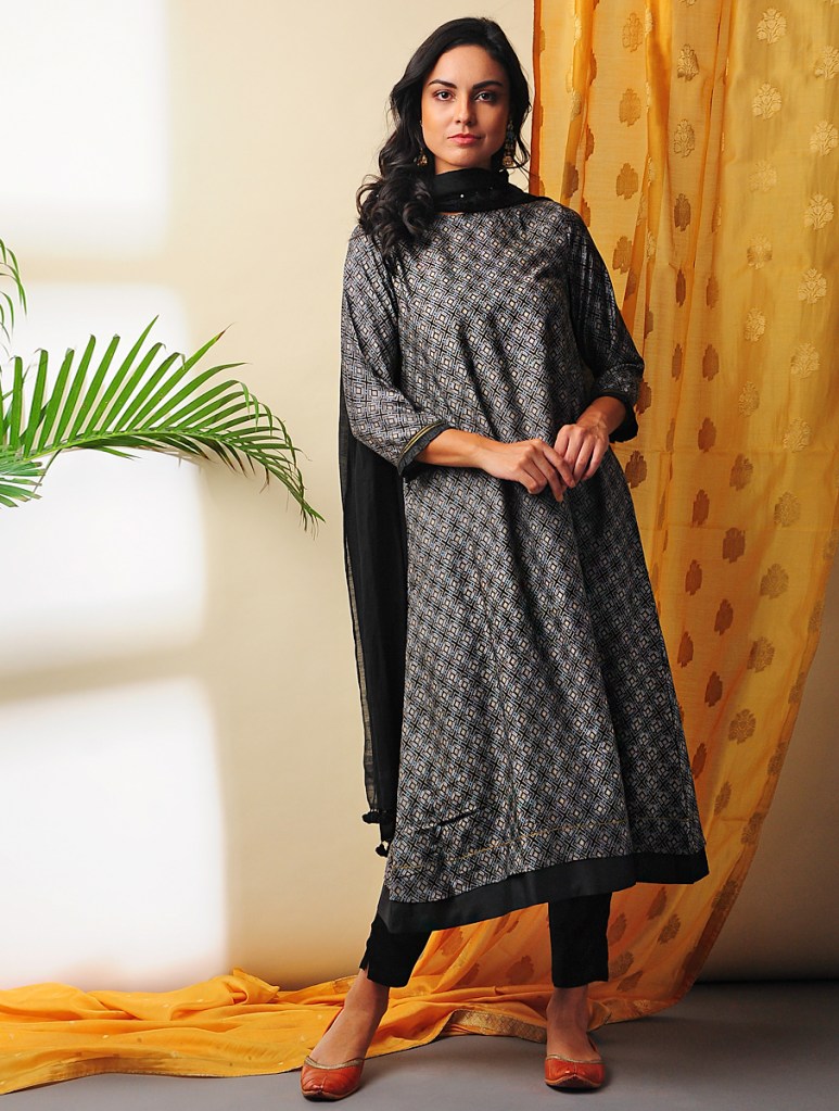 At times like these when you need to be making unforgettable statements, dip into Jaypore’s noir edit, an array of dark-hued silk separates with flashes of gota.