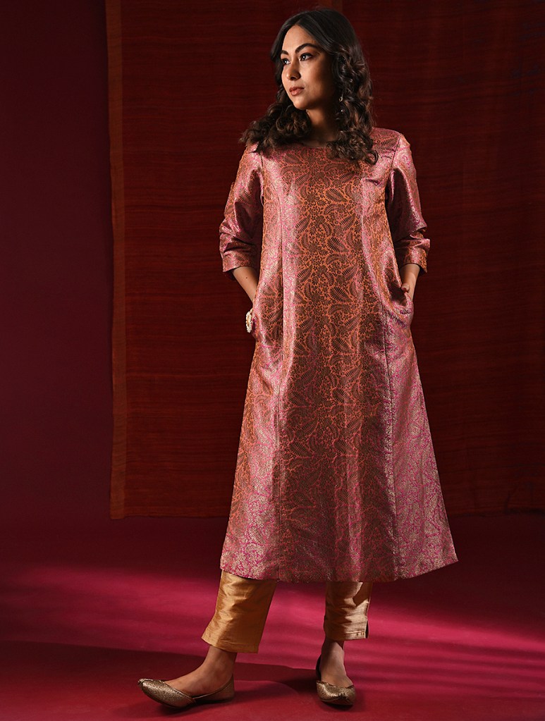 Sartorial statements crafted in brocade, suffused with celebratory pinks, burnished orange, moody blues, and illuminated with traditional Benarasi motifs make up Jaypore’s definitive festive capsule of kurtas, pants, and blouses.
