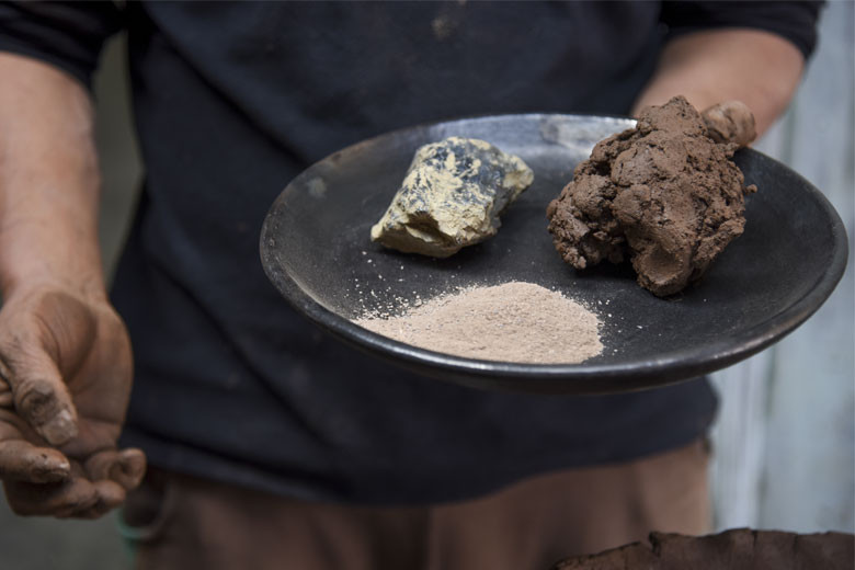 First a mixture of clay and powdered Serpentinite (a type of rock rich in minerals like lizardite, antigorite and chrysolite) is thoroughly kneaded.