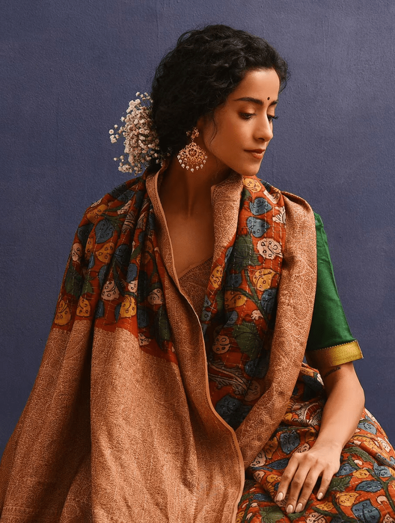 Brilliantly hued flowers & foliage, temple scenes & muggu or the traditional Kolam designs, painted with a bamboo reed qalam (pen) or block printed by hand adorn that visually stunning textile called Kalamkari. Each Kalamkari saree can take weeks to produce, with every color & motif added in layers with the help of resist dying technique. It’s a meticulous 23-step process that includes cloth treatment, sketching, dyeing, printing, numerous washing procedures, and even gold or silver brocade work. This visually striking textile is a perfect blend of art, history & culture, making it an essential piece for your work to festive wardrobe.