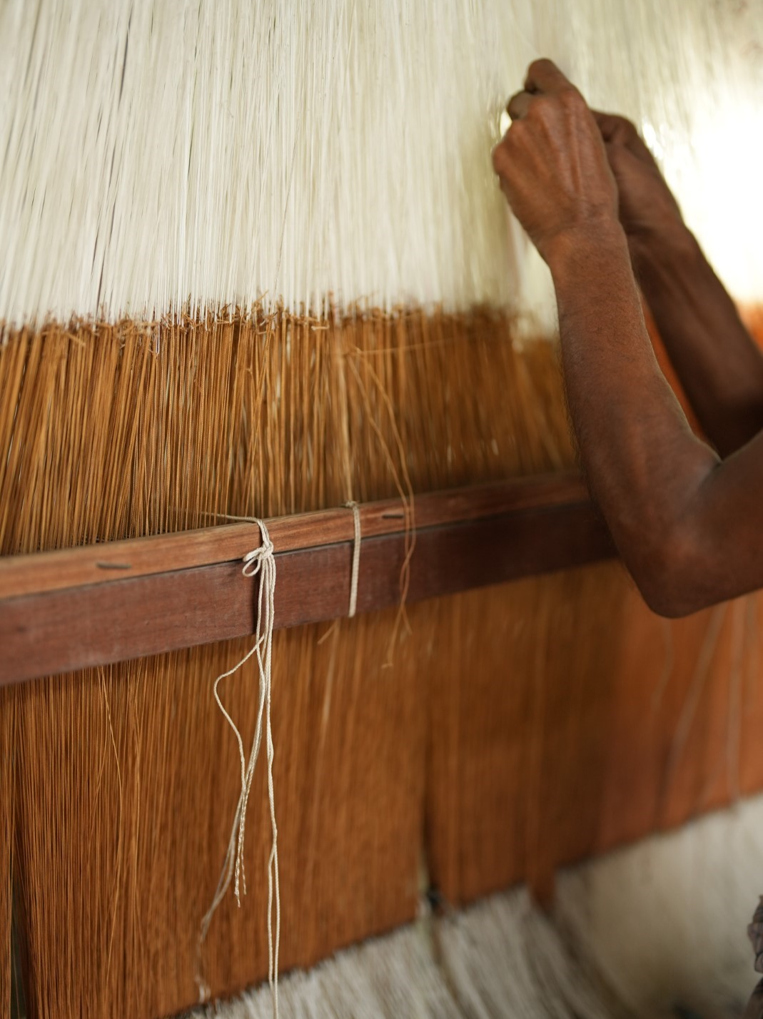 Once our colorful yarn is ready, it’s time to set the warp. This is where the threads are arranged neatly on the loom, standing tall & vertical, creating a sturdy foundation for the fabric. Think of it as laying the groundwork for an intricate masterpiece.