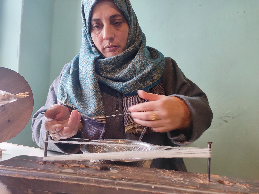 Finally, the slightly stretchy yarn, once dried in the sun, is rewound onto wooden spindles called prech— a process referred to as Tulun in Kashmir.