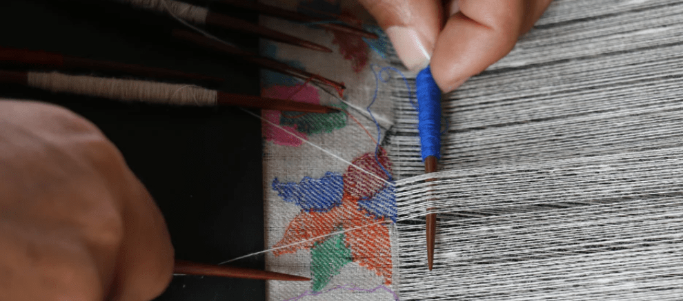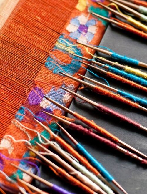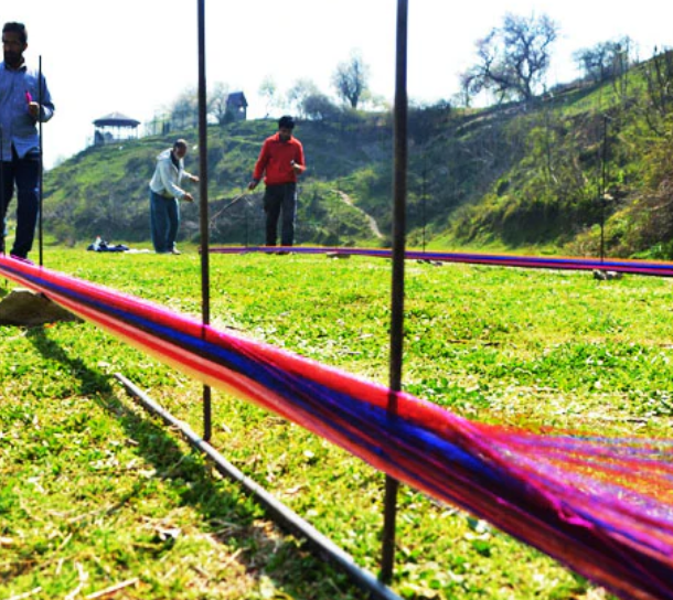 The next step is followed by making the warp. Colorful bobbins are meticulously arranged to match the design, guided by the talim. When a new color is needed, two bobbins are seamlessly joined, continuing the rhythmic process until the shawl is complete.