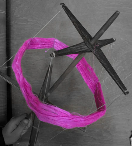 With one hand the spinner holds the spun yarn & turns the prech to give a slight twist to enhance its strength. The final yarn, now in hanks is the next step that transforms the yarn into a ready-to-weave state, bringing it one step closer to becoming an exquisite Pashmina art.