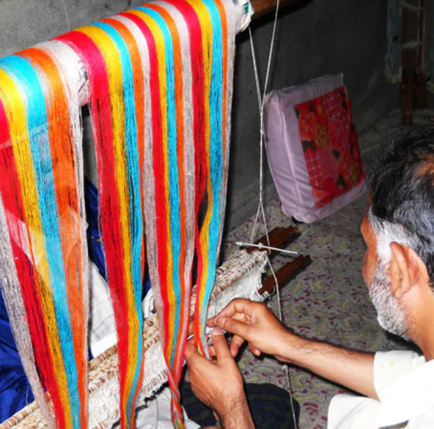 The weft (horizontal threads) is made of fine Pashmina yarn & is passed through the warp using shuttles made of Mulberry wood.