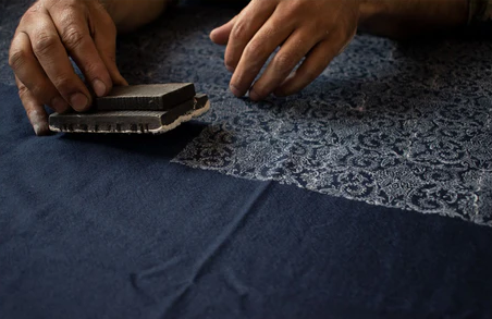 The process begins with artisans using hand-carved walnut wood blocks to stamp patterns onto the fabric.