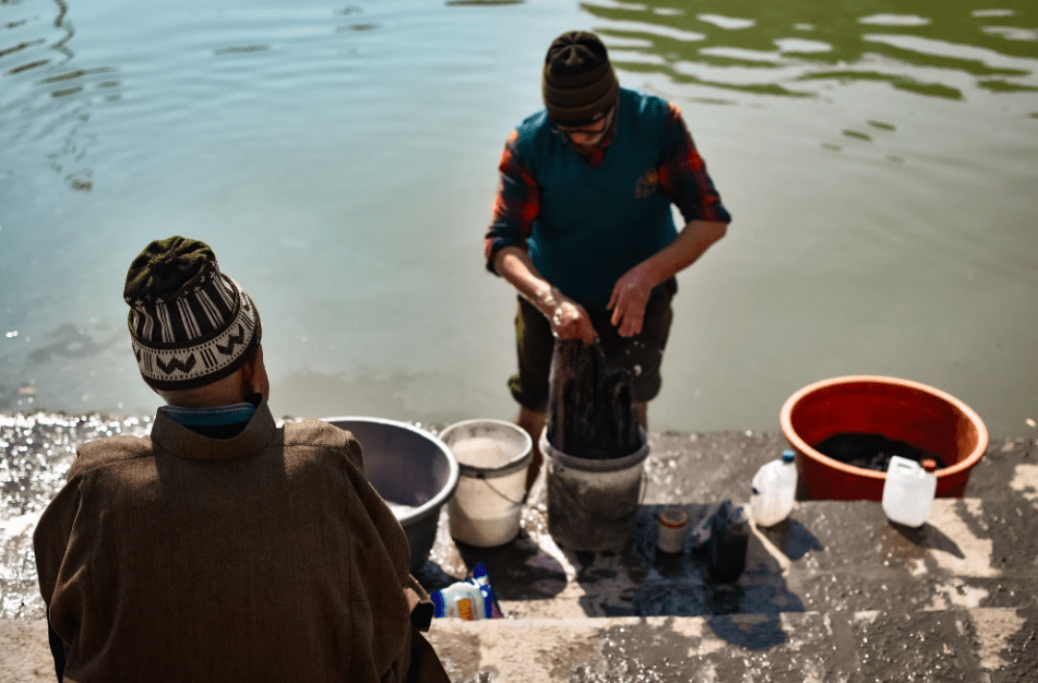 Once woven & embroidered, the shawls undergo a series of finishing processes. The patterned traces on these shawls are thoroughly washed in the rivers flowing down from the high mountains.