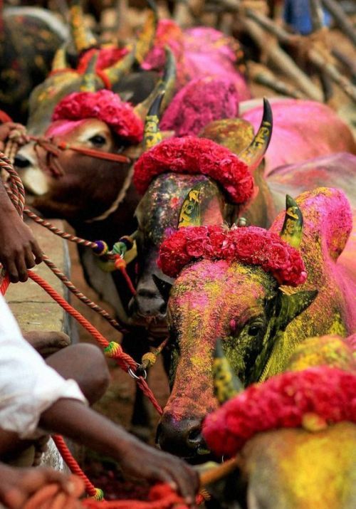 These sacred animals, symbols of hard work & strength, are bathed & adorned with garlands. Their horns are painted with vibrant hues & the fields are alive with prayers of gratitude.