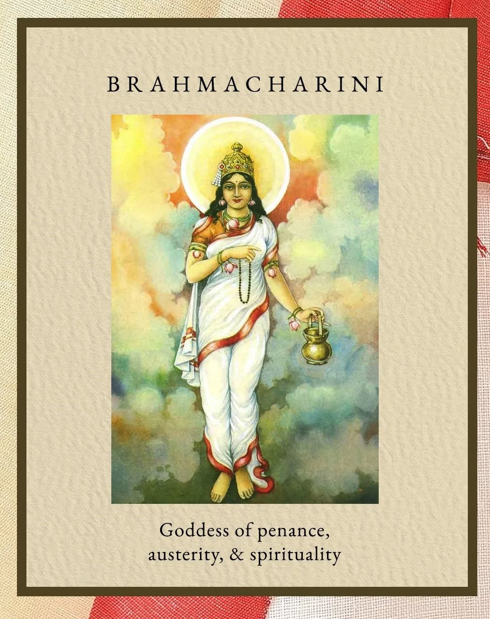 Brahmacharini means “one who is devoted to self-discipline” she’s the second manifestation, the goddess of knowledge & perseverance. She signifies unwavering dedication & quiet resilience her story tells us true devotion conquers all obstacles.