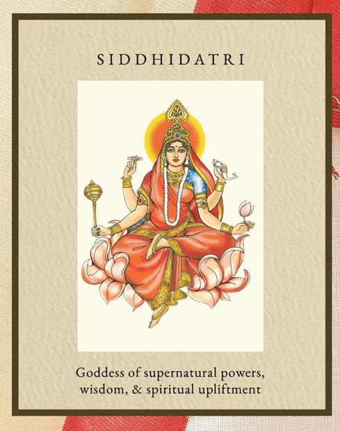 On the ninth & final day of Navratri, we celebrate Maa Siddhidatri, the ultimate form of the Goddess and the divine bestower of supernatural powers, wisdom, & enlightenment. Her name is derived from “Siddhi”, meaning spiritual perfection or divine abilities, and “Datri”, meaning the giver. As the supreme nurturer of knowledge and higher consciousness, she grants eight powerful Siddhis, spiritual attainments that liberate one from worldly limitations. It is believed that even Lord Shiva attained his divine completeness by worshipping her, leading to his transformation into Ardhanarishvara—the perfect balance of masculine & feminine energies.