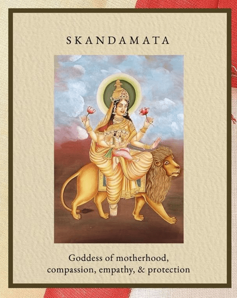 Skandamata, goddesses fifth form is an amalgamation of Skanda warrior god Kartikeya & mata mother thus she was known as the mother of a warrior. Her blessings bring courage, success, & the power to overcome obstacles.