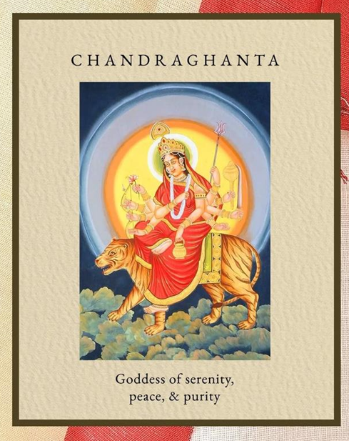 Riding a golden tiger symbolizing courage & strength, she roared into battle, her ten arms wielding weapons of destruction. Her third eye symbolising her inner vision, seeing truths beyond physical world blazed like fire, striking terror into the hearts of demons. The mere sound of her bell sent them fleeing in fear. Chandraghanta is the divine protector of righteousness, reminding the world that grace & fury coexist. An epitome of courage, fearlessness, & justice, teaching us to fight for what is right.