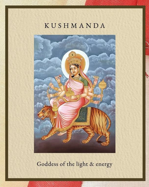 Kushmanda, means “little cosmic egg,” is the divine creator of Brahmanda (the universe). In her fourth form, she shaped the sun, stars, planets, & all life, illuminating existence with her boundless energy.
