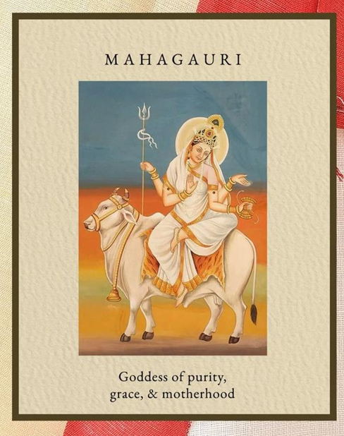 Mahagauri, meaning “great white,” represents the purest & most radiant form of the Goddess, glowing like the soft light of the full moon. She is the epitome of serenity, patience, and ultimate liberation, symbolizing the spiritual transformation that occurs when one sheds impurities of the mind and soul.