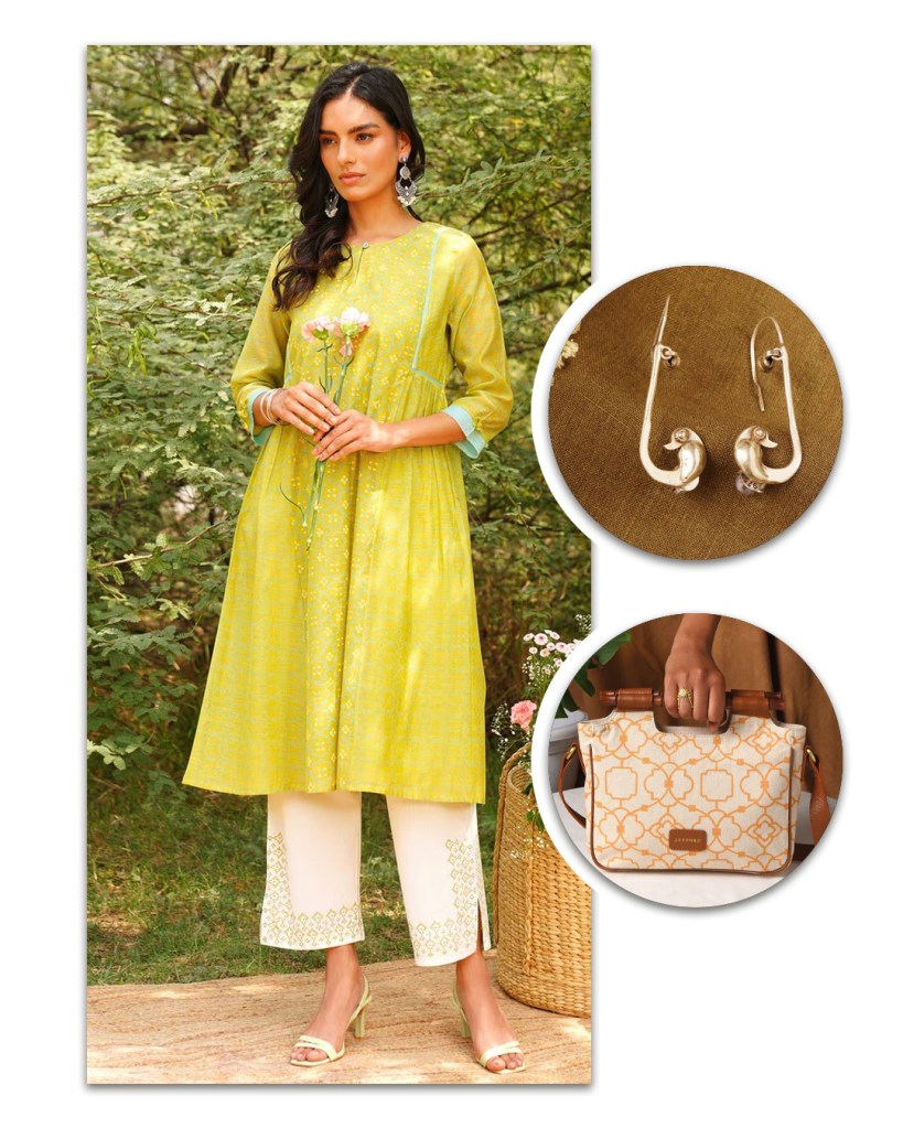 Monsoon begins with the smell of the damp earth, the brooding dark grey colour of the sky, and the whisper from the rustling leaves. Such a moment is an invitation to wear a garment that is anchored in the rich craft stories of India. And what better way than to adorn the softest cotton or cotton silk block-printed kurta set.