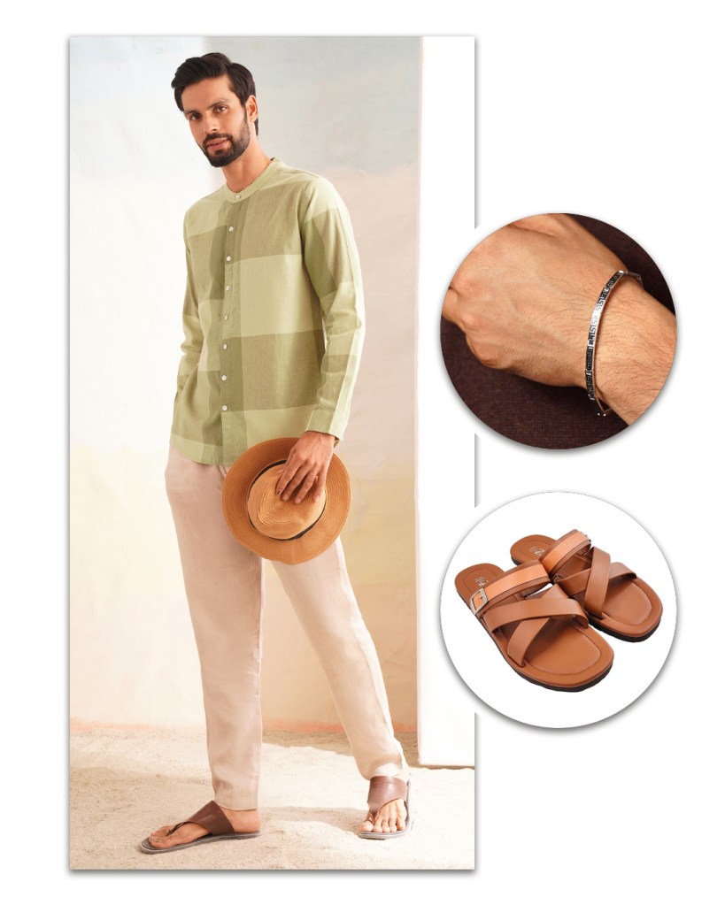All those rainy monsoon mornings call for the calmness of the linen. A dusk or slate-toned linen shirt paired with wide-legged linen trousers offers ease and elegance. To elevate the look further, top it off with tan brown rubber sandals.
