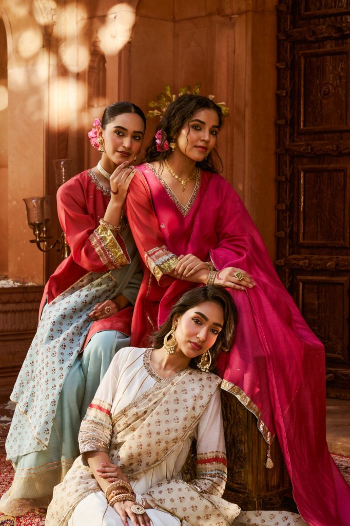 Brought to life through the hands of skilled artisans, using time-honored crafts of block-printing, delicate hand embroidery, shimmering zari, and intricate gotta-patti work. These techniques echo the richness of Nizami aesthetics, where every stitch and motif carry a story. The palette evokes regal splendour, deep reds and subtle golds, classic black and lush green, with jewel tones like ruby red and sapphire blue adding depth and drama. It’s a celebration of craft, color, and culture, woven with memory, worn with pride.