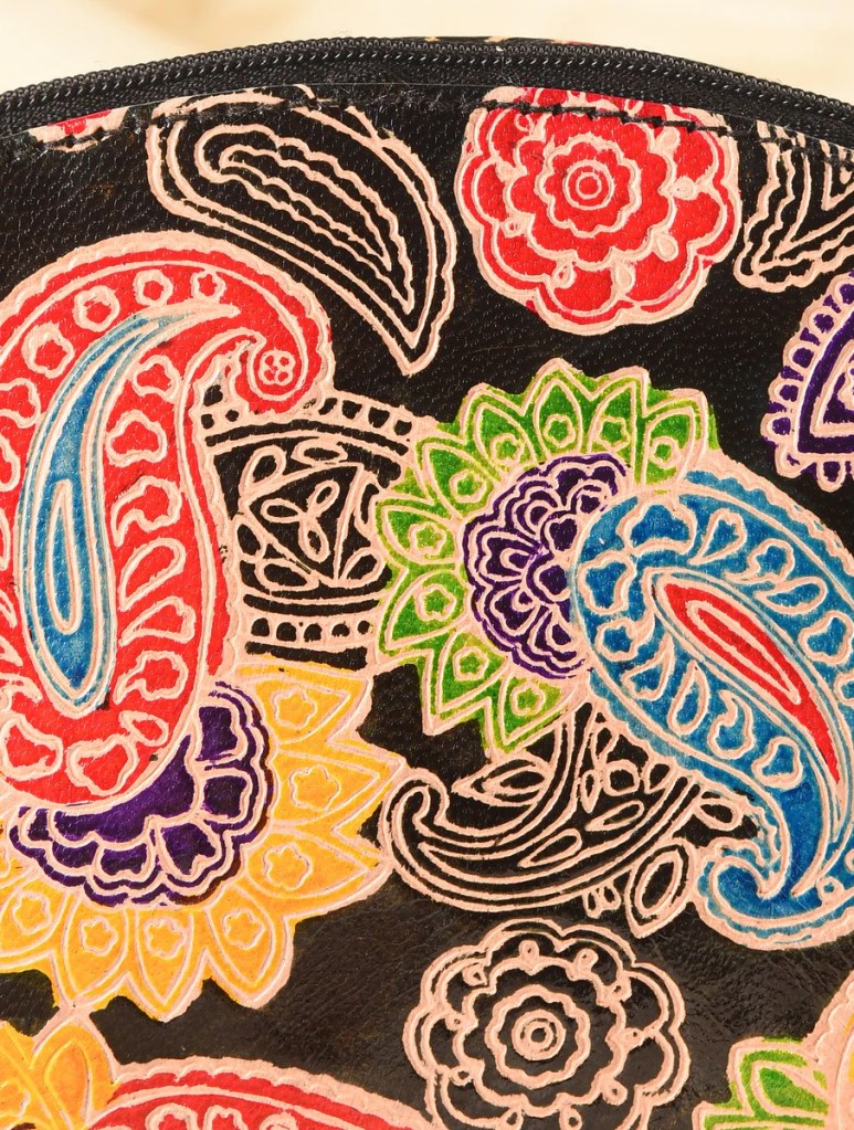 Shanti leather follows a design approach that is rooted in function first, with clearly defined forms such as structured totes, crossbody bags, wallets, and utility pouches. The silhouettes are kept clean and practical, with features like sturdy handles, secure closures, and well-planned compartments for everyday use. What sets these pieces apart is the surface detailing. Artisans use embossing techniques to create motifs inspired by nature, folk art, and scenes from rural life, often featuring florals, animals, or traditional patterns. These designs are pressed by hand, giving each piece slight variations that make it unique.